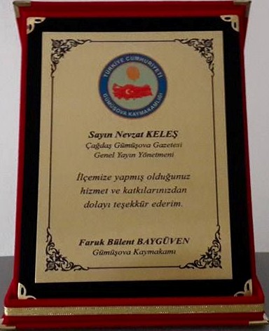 Gümüşova Kaymakamı Faruk Bülent Baygüven ,Çağdaş Gümüşova gazetesi Genel Yayın Yönetmeni Nevzat Keleş’e Gümüşova İlçesinde yapmış olduğu hizmet ve katkılar dan dolayı bir pleket verdi.