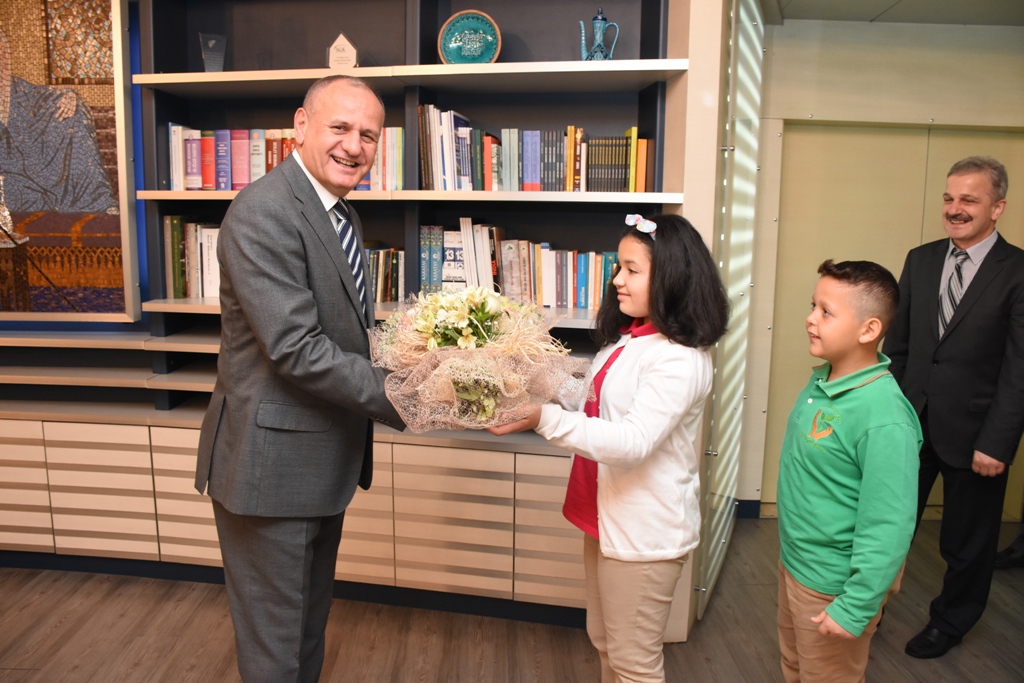 Temsili olarak Belediye Başkanlığı koltuğuna oturan öğrenciler Elif Ravza Yıldırım ve Eren Argun daha sonra Belediye Başkan Yardımcıları Ali Güney ve Şemsettin Yenersoy’a istekler hakkında talimatlar verdi.