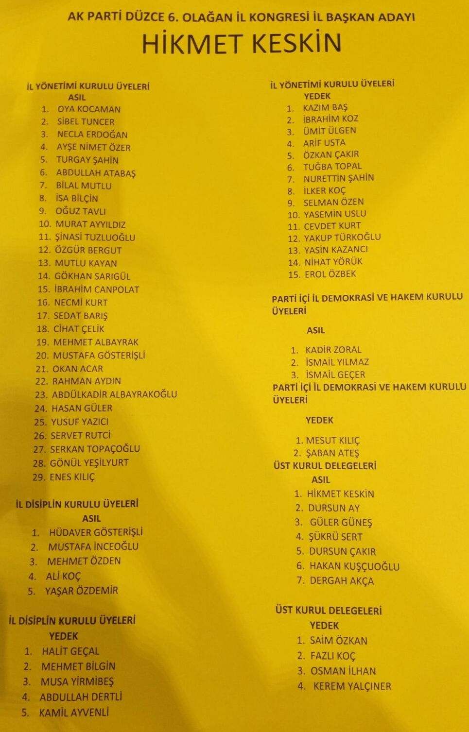 Hikmet Keskin'inin yeniden aday olduğu AK Parti Düzce İl başkanlığı İl Yönetim Kurulu’nu oluşturan isimler belli oldu.
