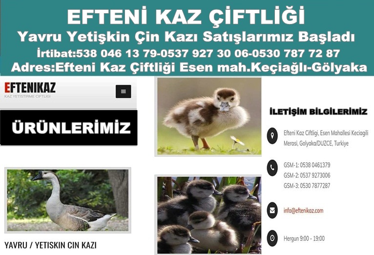 Düzce’nin Gölyaka İlçesinde Çin kazı yavru satışlarının başladığını belirten işletme sahibi Oguzhan Yavuz,’’Gölyaka Keçiağlı mahallesinde bulunan Efteni Kaz Çiftliğimizde yetiştirdiğimiz Yavru Çin kazı satışlarımız başlamıştır.Vatandaşlarımızın yoğun talepleri var.Tamamen doğal ortamda üretimini yaptığımız Yavru Çin kazı satışlarımız başlamıştır.’’dedi