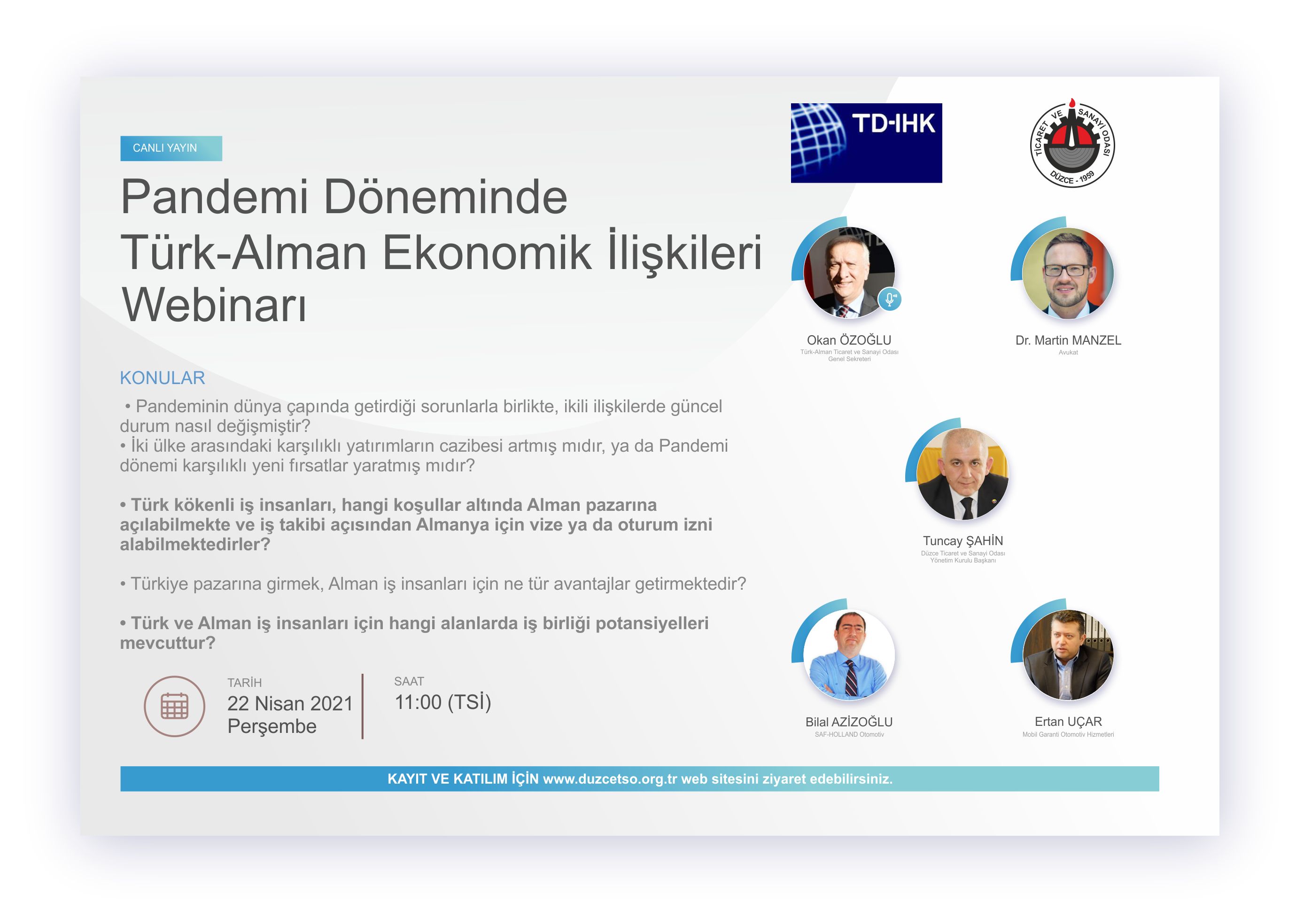 Düzce Ticaret ve Sanayi Odası’nın da üyeleri arasında yer aldığı Alman-Türk Ticaret ve Sanayi Odası, Almanya ve Türkiye arasındaki ilişkiler, Pandemi sonrası ticaret mekanizmaları ve ikili ilişkilerin ele alınacağı webinar gerçekleştirecek.