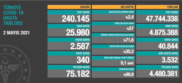 Buna göre, Türkiye'de son 24 saatte 240 bin 145 Kovid-19 testi yapıldı, 25 bin 980 kişinin testi pozitif çıktı, 340 kişi yaşamını yitirdi, hasta sayısı 2 bin 587 oldu.