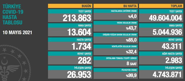 Bakanlıkça paylaşılan tabloda, salgına dair tüm detaylar yer alıyor. Vatandaşlar ise yeniden normal hayata dönülecek tarih için günlük olarak tabloyu takip ediyor. Özellikle vaka sayısı bu durumda kritik öneme sahip. 10 Mayıs tablosu da açıklandı. Buna göre, 13.604 yeni vaka tespit edildi ve 282 kişi hayatını kaybetti.