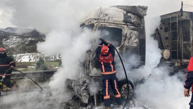TIR'ın çekicisi tamamen yandı, söndürme çalışmaları sırasında yolun Ankara istikameti tek şeritten sağlandı.