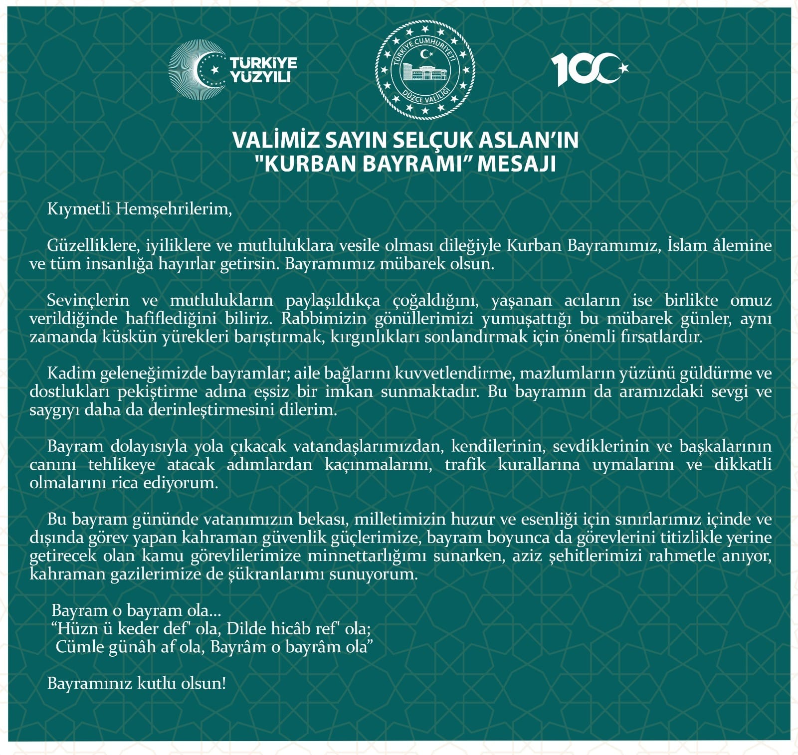 Düzce Valisi Selçuk Arslan'ın Kurban Bayramı mesajı