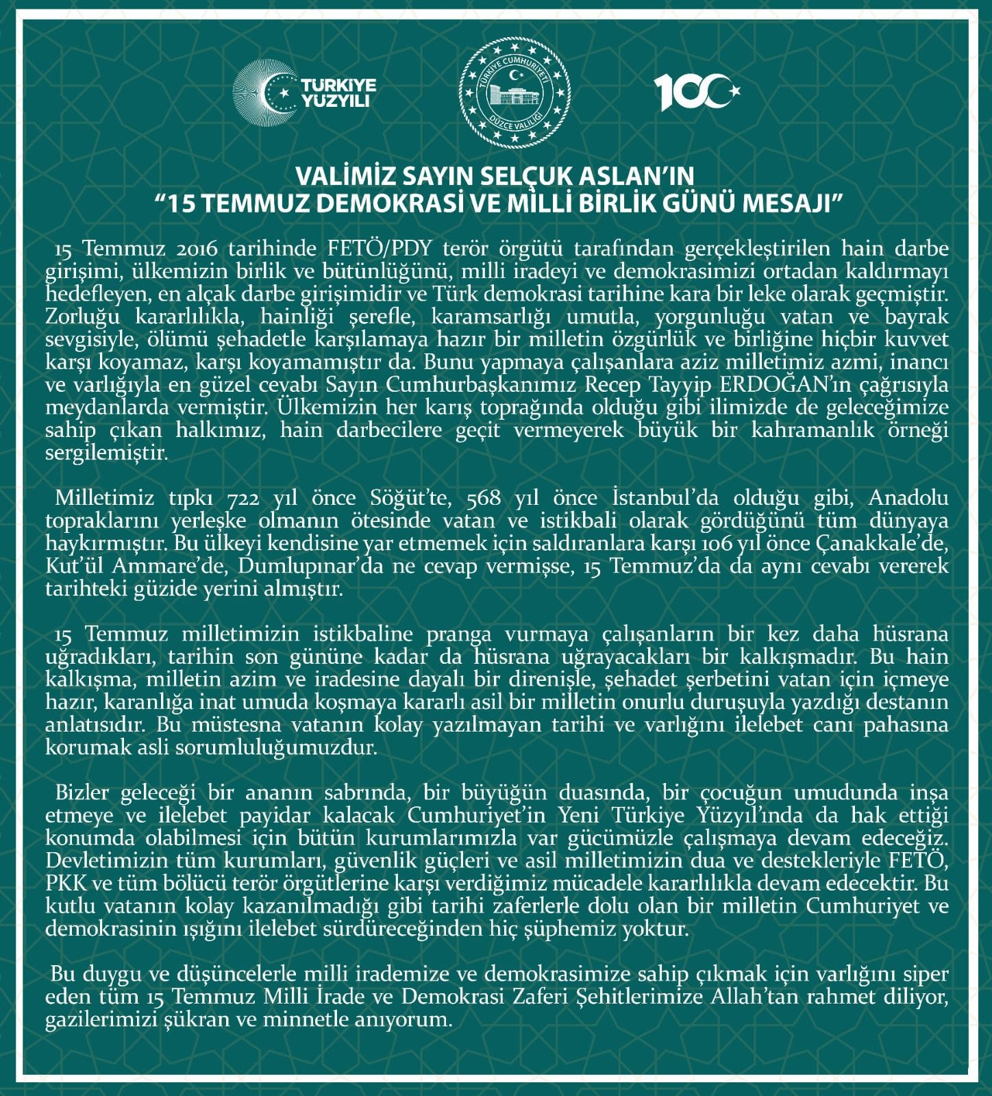 Vali Selçuk Arslanın 15 Temmuz Demokrasi ve Milli Birlik Mesajı